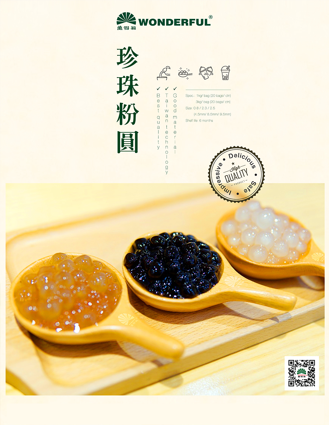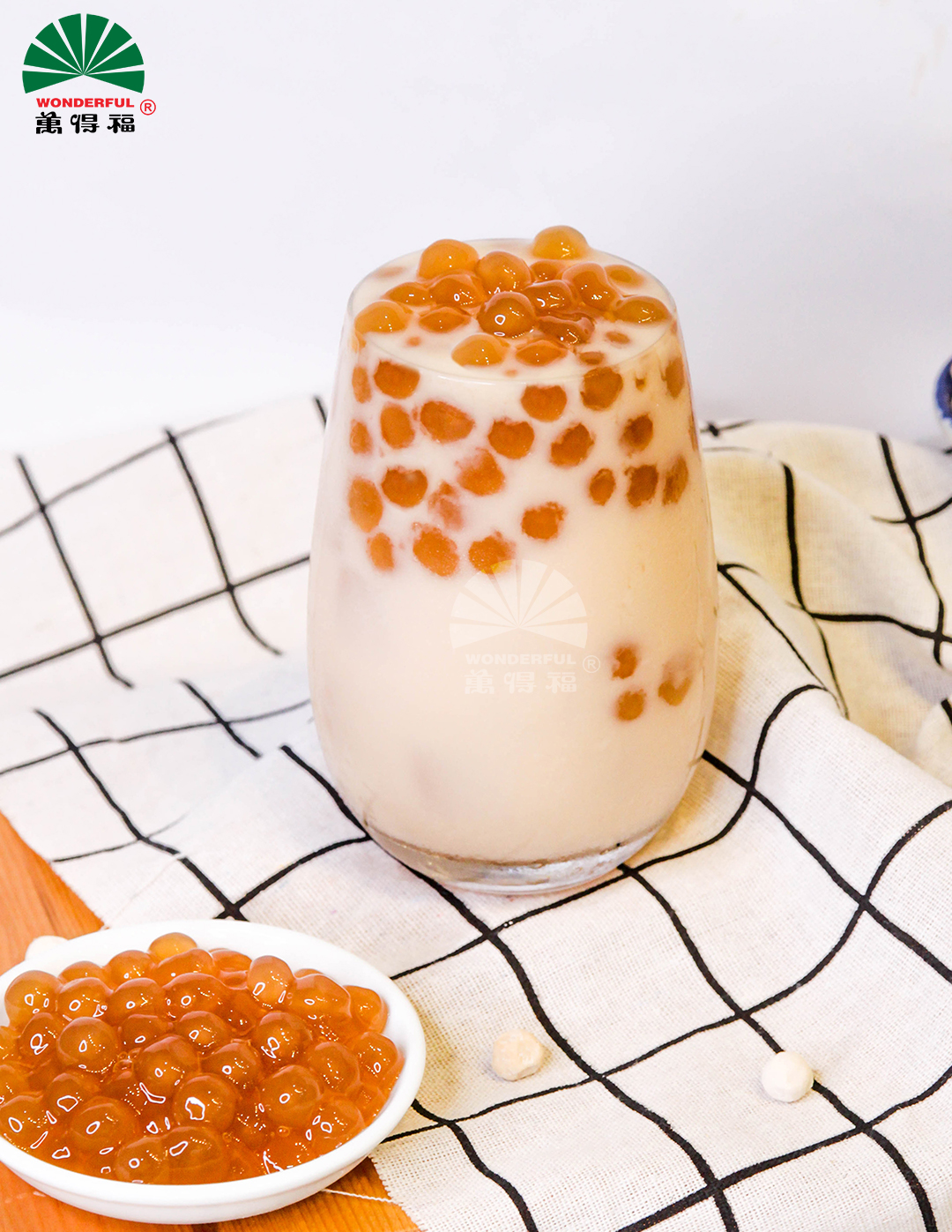 Trân châu: Được sản xuất bởi nguyên liệu tinh bột sắn nhập khẩu cao cấp, kết hợp cùng phương pháp truyền thống cùng hệ thống máy móc hiện đại tạo nên sản phẩm trân châu Wonderful dai, giòn khó cưỡng. Thời gian bảo quản lâu dài, trân châu Wonderful luôn đóng vai trò chính trong các sản phẩm tiêu thụ của công ty!